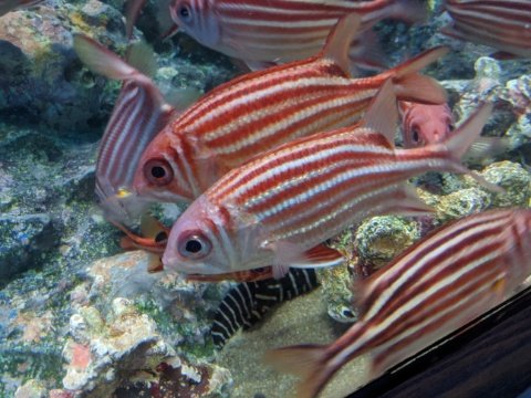 赤と白のボーダー柄がきれいなアヤメエビス。キンメダイ目なのでじっとしているかと思いきや、かなりせわしなく泳ぎ回ります。キラキラしていてとってもきれいな魚です。