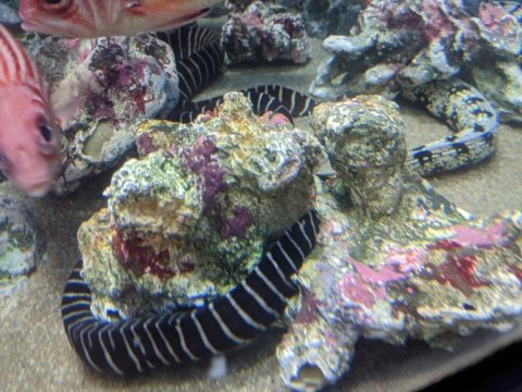 そんなアヤメエビスの下の方にいるのはゼブラウツボ。水槽の底でうねる黒と白のストライプが印象的。奥には、クッキークリームみたいな柄のクモウツボもいます。