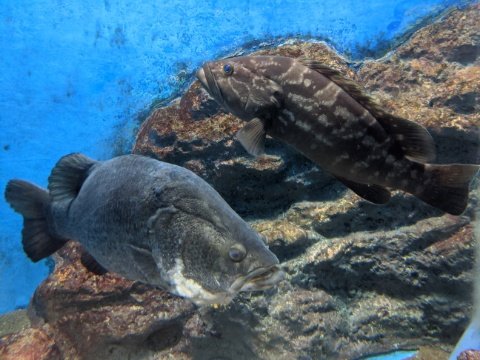 クエとアカメが泳ぐ水槽。この2種の組み合わせってとっても珍しい!どちらもスズキ目のちょうど同じくらいの大きさのサカナ。2匹並ぶと、なんだかライバル感が漂います。