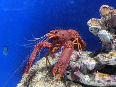真っ赤な体に白い斑点が入るショウグンエビ。朱塗りでゴツゴツした姿は、将軍の名のイメージ通り戦国武将の鎧カブトの様。でも、なんだかザリガニにも見えます。