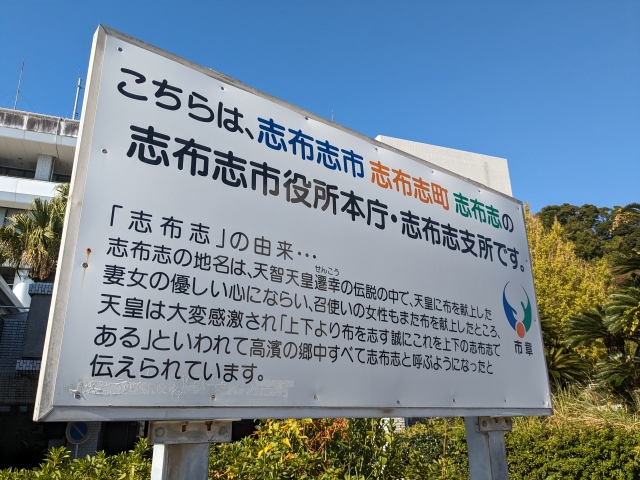 志布志の名は鎌倉時代の文献にも登場する歴史ある地名。看板に記されていたその名の由来は以下の通り。