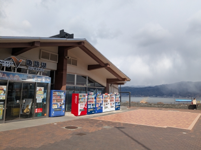 12:00頃、諏訪湖SAで休憩。山々にかかる雲が幻想的です。