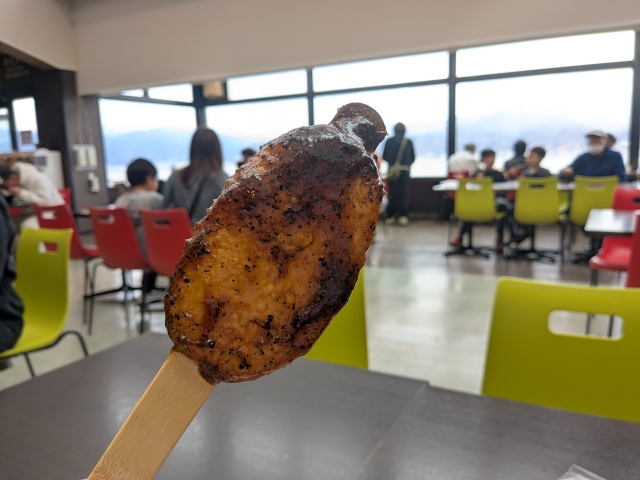 串に刺さった山賊焼き、馬肉を使ったさくら丼などご当地グルメが多数。ここは軽く、ということで五平餅にしました。甘口の味噌がとっても美味しい。