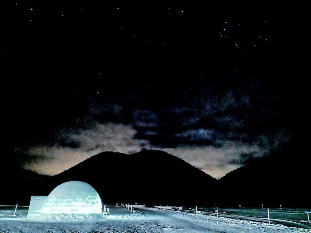 イグルーのひとつは、「アイスロッジ」と呼ばれる宿泊施設でもあるそう。こんな氷の家に泊まって眠れるのかと思ったのですが、断熱ベッドに寝袋で泊まるため意外と暖かいとのこと。予約は「然別湖畔温泉ホテル風水」で行っており、食事はホテルのレストラン、さらにホテルの部屋も付くのでもし寒くなったら部屋に避難もできるそう。ただし1日1組限定なので、予約はかなり取りにくそうです。