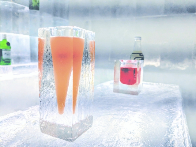 氷でできたバーカウンターや、お酒の瓶が並ぶフォトスポットも。神秘的な雰囲気です。