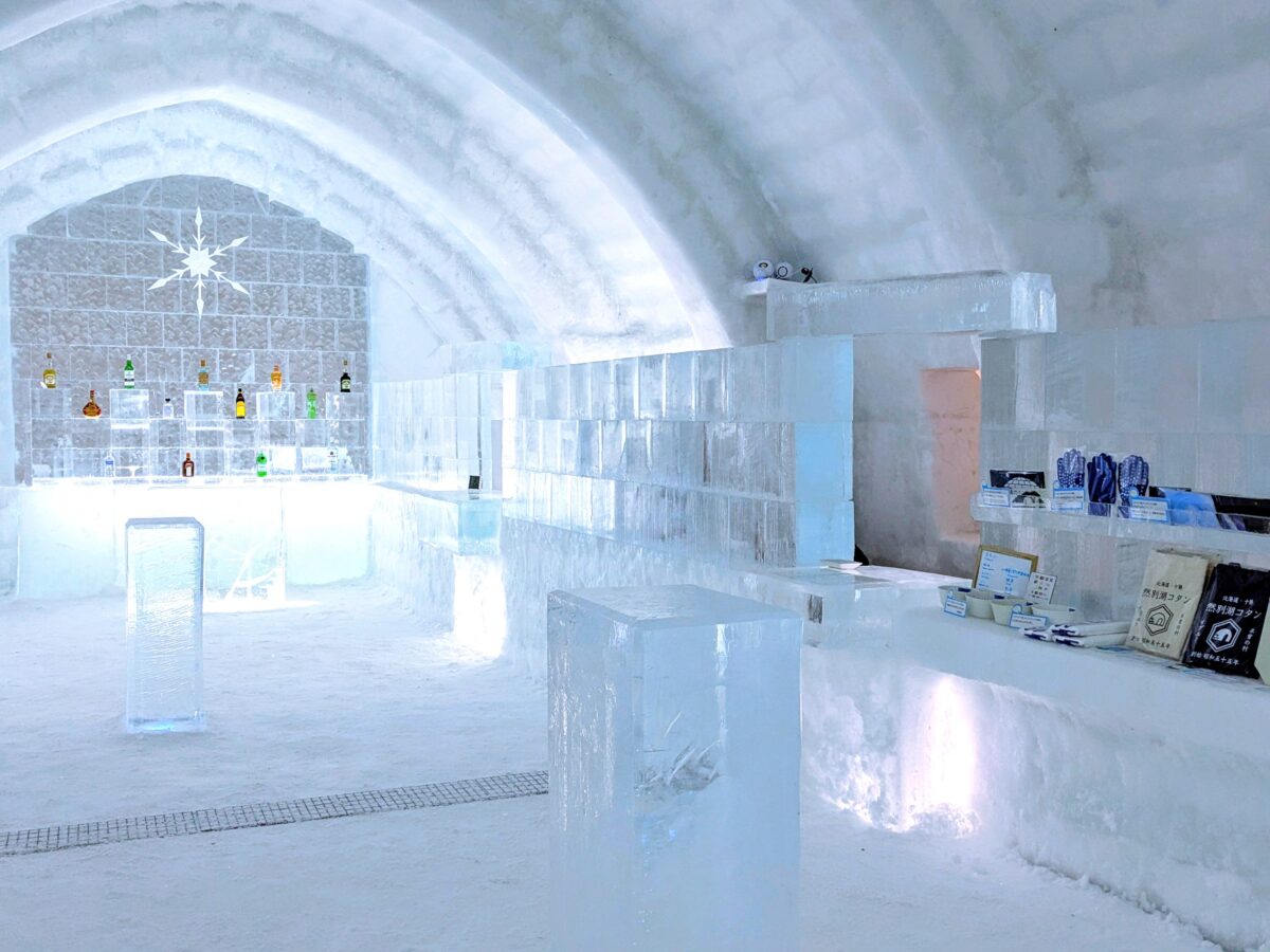 氷でできたバーカウンターや、お酒の瓶が並ぶフォトスポットも。神秘的な雰囲気です。