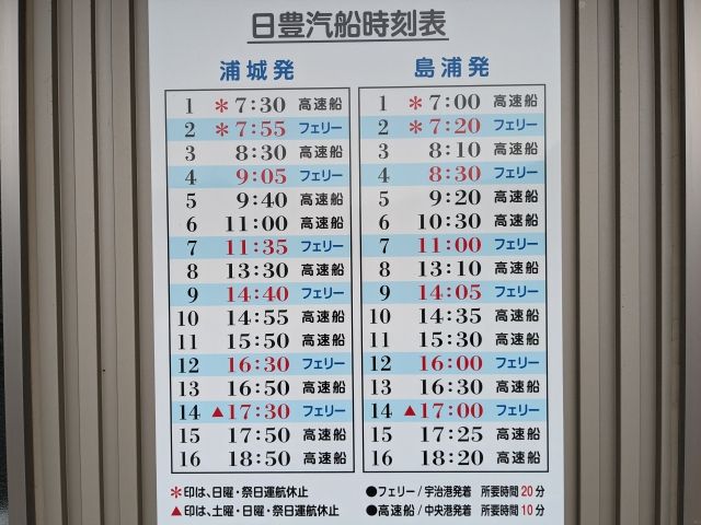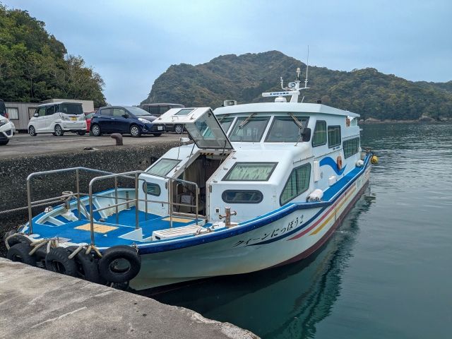 注意するのは、島浦島側では高速艇は「島浦港(中央)」、フェリーは「宇治港」と立ち寄る港が異なります。それぞれの港の距離は1kmほど。徒歩でも15〜20分ほどで移動できます。