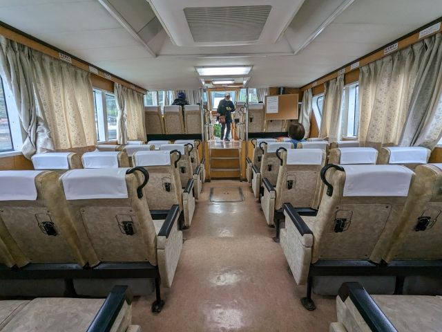 今回乗船する高速船「クィーンにっぽう2」。基本は室内シート、60席くらいあってけっこう広々としています。