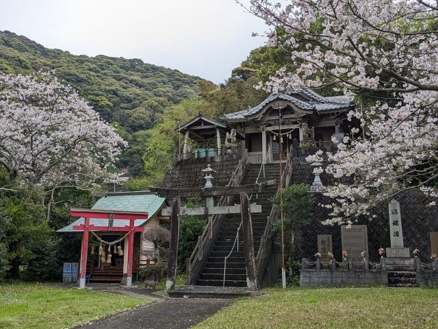 島浦島に到着。今回の一番の目的は、島の最高峰である遠見場山の登山!まずは港から歩いて島野浦神社へ。