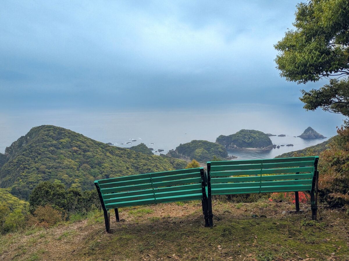 素晴らしすぎるベンチの展望所に到着。寄り添うように2つ並んでいる様子、そして緑色のカラーリングがまた良い感じです。