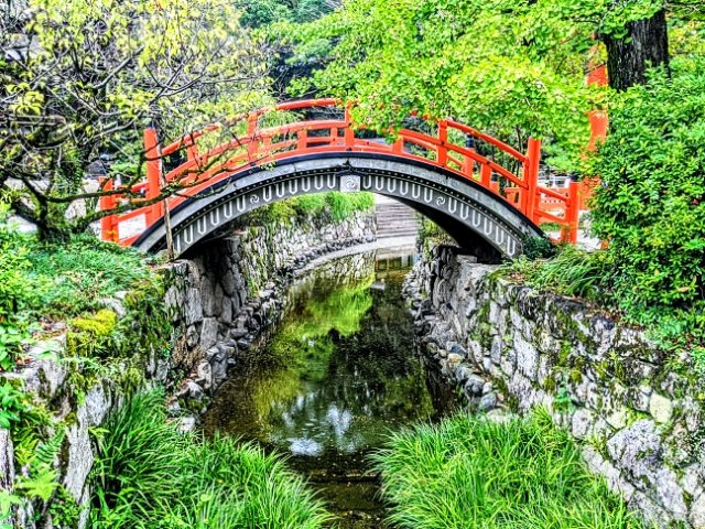 境内に流れるのはみたらし川。朱塗りの太鼓橋は輪橋(そりはし)がなんとも絵になる光景です。
