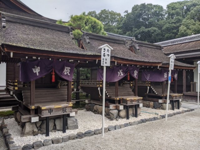 御本社の前には、小さな社が7つ。こちらは十二支の社で正式名を言社といいます。子年は大国主神、巳年と未年は大国魂神、寅年と戌年は大己貴命、といったように、7柱の神様が干支を司ります。
