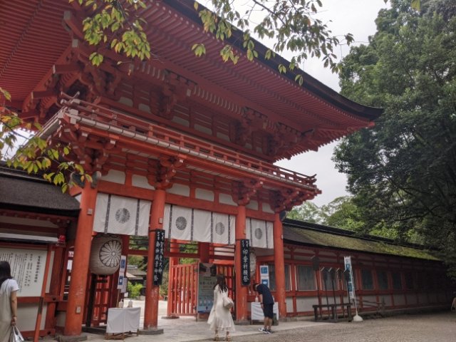 糺の森を抜けると、立派な楼門が見えてきます。高さ13mにも及ぶ大きな門で、重要文化財にも指定されています。朱塗りの姿は、下鴨神社を象徴する建築です。