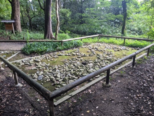 柵に囲まれているのは2001年の発掘調査によって見つかった古代の祭壇跡・祭祀遺構。平安時代から江戸時代まで混在した遺構に加えて、縄文土器も発掘されたそう。古来よりこの地に人々が暮らしていたことを物語ります。