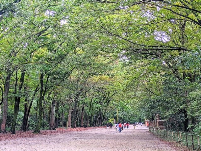 木々が生い茂る参道。糺(ただす)の森という名が付けられた広大な原生林が広がっています。