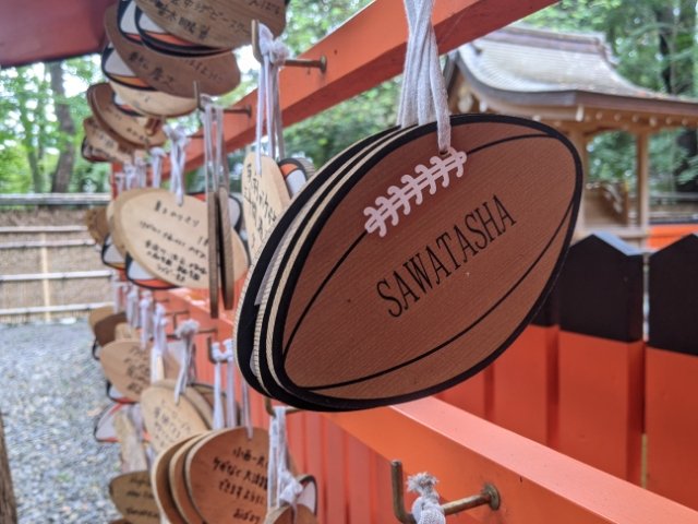 ラグビーボール型の絵馬も奉納されており、必勝や無怪我など、ラガーマンたちの様々な願いが込められています。