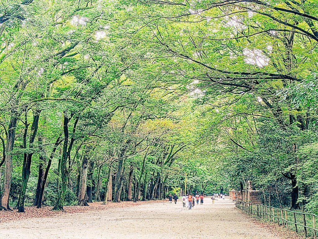 木々が生い茂る参道。糺(ただす)の森という名が付けられた広大な原生林が広がっています。