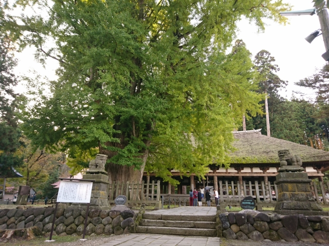 境内には枝を大きく広げた大イチョウがそびえ立っています。樹高は約37m、幹周りは8mで、樹齢は800年以上といわれています。