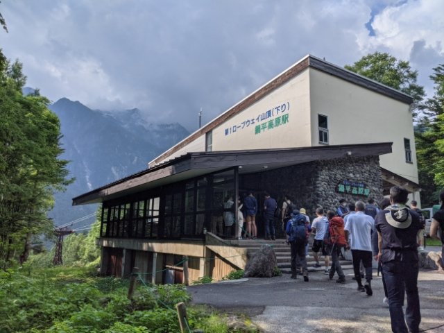 まずは新穂高温泉駅から第1ロープウェイへ。出発時間は、毎時00分・30分の1時間に2本。乗り場は温泉街の中にあるため、駐車場探しにちょっとだけ苦労しました。