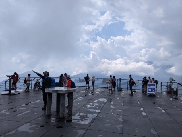 最上階は開放的な展望台。ロープウェイですいすい登ってきましたが、その標高は2,156mとかなりの高所。空がすぐ近くに感じます。正面に見えるのは、笠ヶ岳、抜戸岳など北アルプスの山々。写真では雲しか写っていませんが、肉眼では迫力ある姿を見ることができました。
