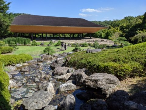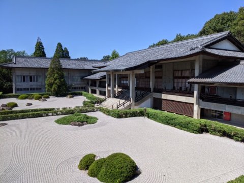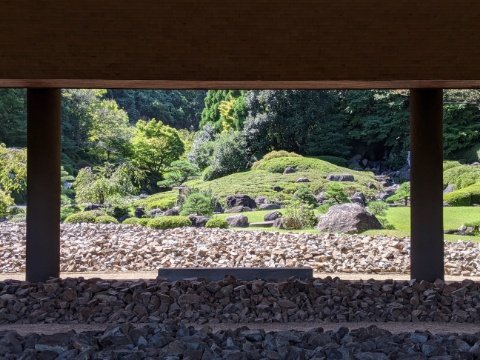 建物の前には池泉回遊式庭園が広がります。丁寧に手入れされた庭園と、一面に敷き詰められた礫が全体の世界感を作り上げます。