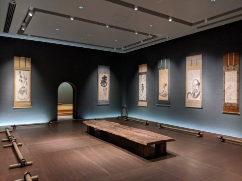 この荘厳堂の内部は、江戸時代の禅師・白隠(はくいん)の作品を展示するミュージアムとなっています。並ぶのは、禅の教えや禅僧を描いた水墨画。広く民衆に布教を行った白隠は、絵を用いて人々に禅の教えを説いていました。