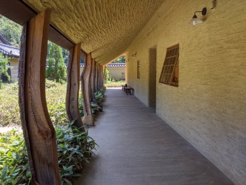 軒先は回廊状になっているのですが、ここもおしゃれカフェのような洋風な造り。土の壁からはぬくもりを感じます。