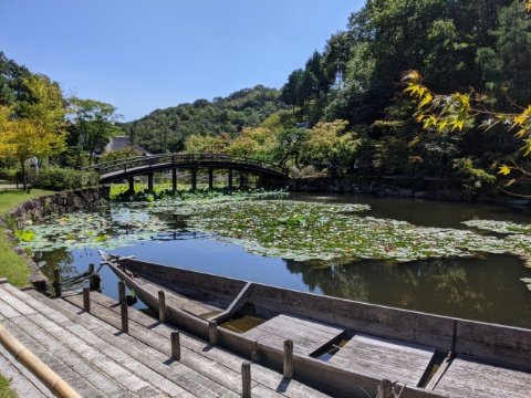 まるで川のような池もあります。太鼓橋や木舟、そして蓮の葉が浮かんでおり風流な雰囲気を引き立てます。