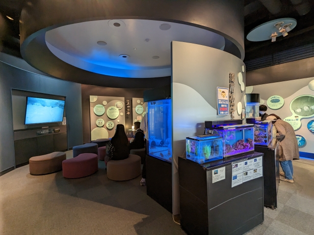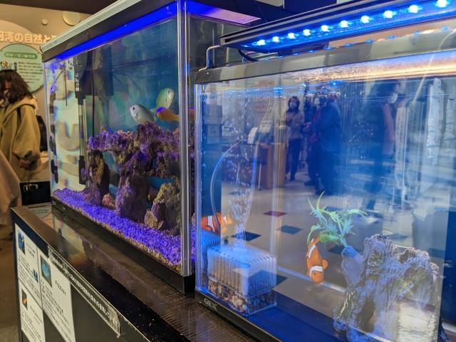 展示室には水槽が設置されており、カクレクマノミ、ナンヨウハギ、ケラマハナダイなど色鮮やかなサカナたちが飼育されています。ちょっとした水族館みたいな雰囲気です。