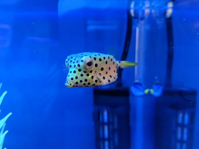 ふよふよと泳ぐミナミハコフグ。黄色に黒のドットが鮮やかで、草間彌生の南瓜が浮かびます。このカラーリングは幼魚のとき限定。成長すると、茶色に白ドットへと色合いが変わります。