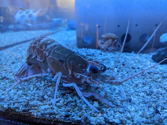 アカザエビとその奥にはイチョウガニ。いずれも深海に暮らす生き物ですが、なんと深層水の取水管を通ってやってきたそう。
