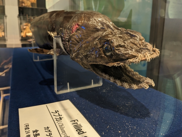 展示されたラブカの剥製。生きた化石とも呼ばれる古代のサメです。歯が非常に特殊で、コンベアのように生え変わる歯がそのまま口の外に続いています。