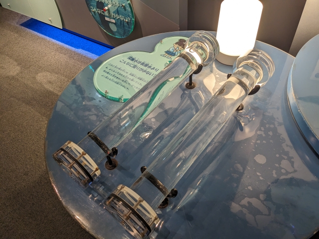 館内には、シリンダーに入った表層水と深層水の透明度を比較できる仕掛けもあります。確かに、見比べて見るととってもクリアです。