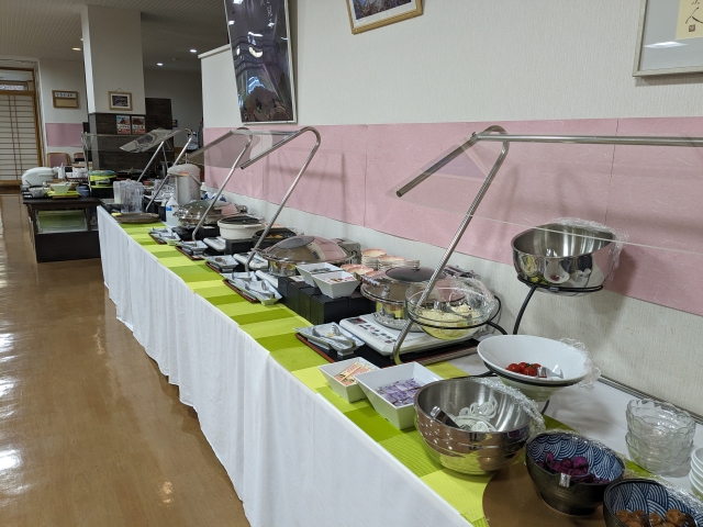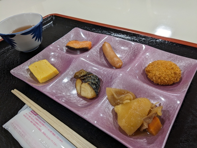 朝食はバイキング形式。サラダや焼鮭、ウインナーなど定番メニューがそろっています。北見名産のタマネギを使用した名物「たまコロ」も食べることができました・・・!