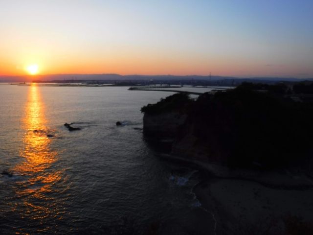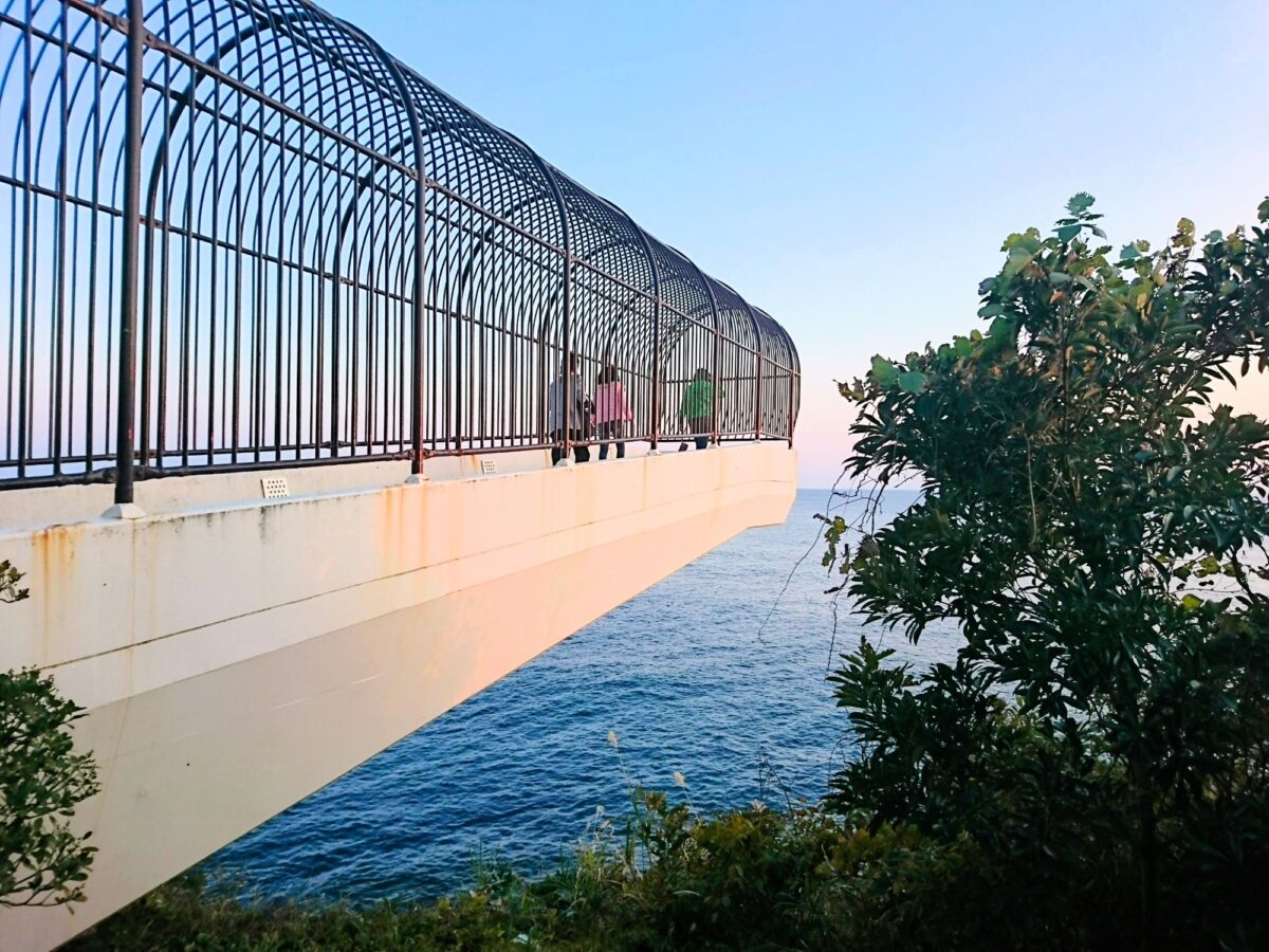 三崎公園の潮見台は、海に突き出した海上デッキを備えています!足元に広がる断崖絶壁を見たら高所恐怖症じゃなくても足ががくがく。最近ちょっとドキドキが足りてない、そんな方におすすめの展望台です。
