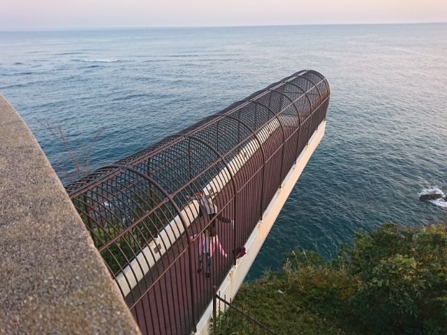 眼下に広がる岩礁を見ていると、海に突き出した謎のデッキが目に入ります。まるでカゴのように柵に覆われていますが、中を歩く人の姿が・・・!