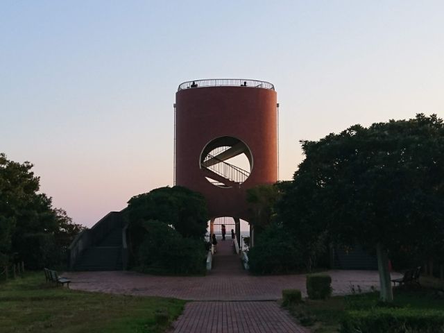 園内を南へと進み、海辺に差し掛かったあたりで見えてくるのが潮見台。レンガ風の少しレトロなデザインで、真ん中にぽっかり空いた穴がアーティスティックな雰囲気です。