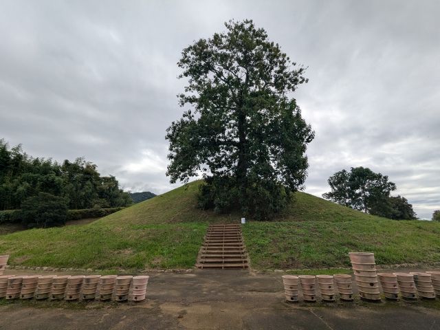 葺石が敷かれ、多数のハニワが並ぶ姿が復元された見ごたえのある古墳。すぐ側にはガイダンス施設もあり、出土品も展示されています。なかなかパンチのあるキャラクターもいますよ!