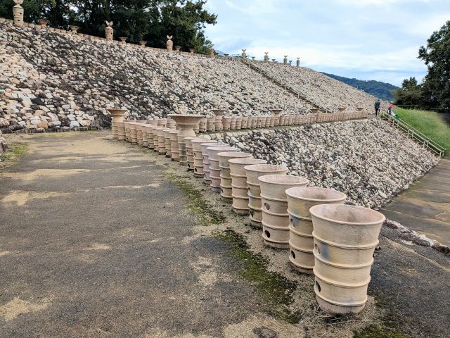 前方部は墳丘上に石が並べられた「葺石(ふきいし)」が復元されています。ここもまた円筒埴輪と朝顔形埴輪がびっしり。この古墳は墳丘上の道が舗装されているのでとっても歩きやすいです。