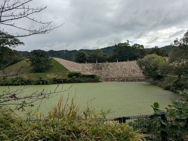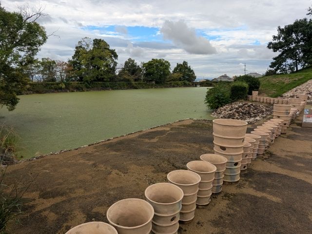 心合寺山古墳は、古墳時代中期につくられた前方後円墳。その全長は160mと巨大な姿。濠は藻で緑色に染まっていますが、これはこれであざやかな色彩。