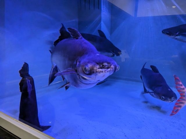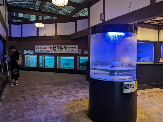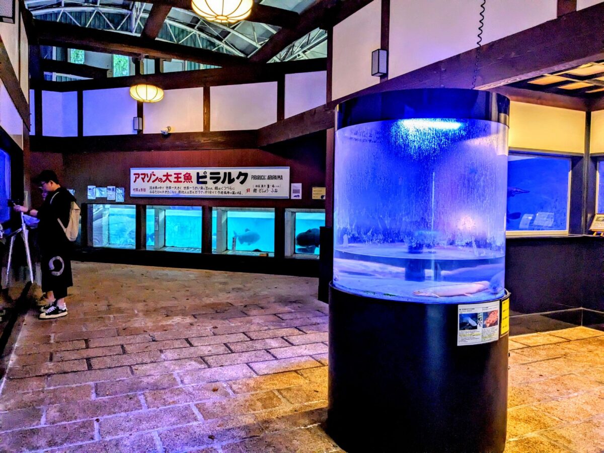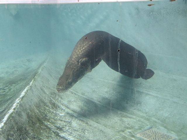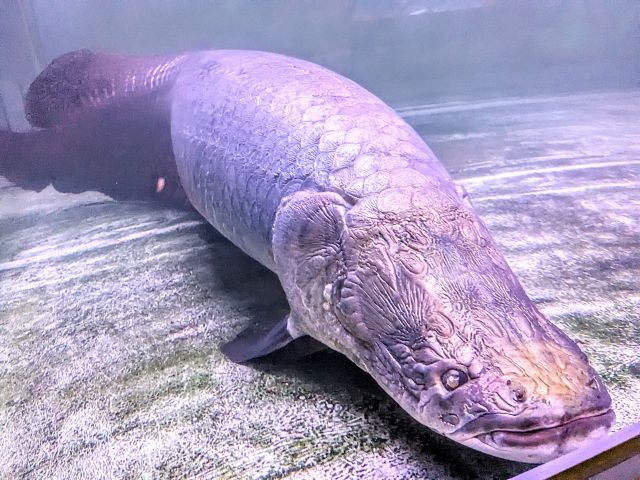 館内の目玉は、「アマゾンの大王魚」ことピラルク。1.7mほどの個体が泳いでいます。