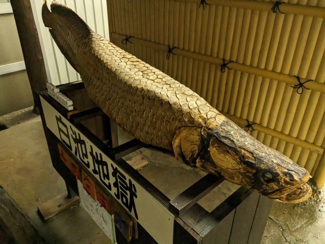出入り口の売店ではピラルクのストラップも販売しており、グッズである白池地獄タオルにもその姿が描かれています。この地獄のシンボルとして愛されているのでしょうね。