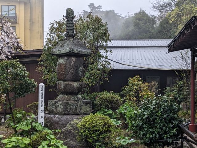 高さ3m弱の大きな石塔で、「国東塔(くにさきとう)」と呼ばれる大分県国東半島を中心に分布する宝塔の一種。南北朝時代末ごろ作と推定され、県指定有形文化財にも指定されています。