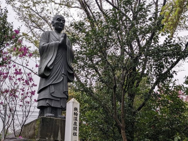 そびえ立つのは鉄輪と所縁のある「一遍上人像」。初代は2016年の熊本地震の際に倒壊してしまい、現在は二代目だそう。一遍は、建治2年(1276年)、鉄輪を訪れます。人々が荒地獄に悩まされているのを知り、大蔵経を一字一石に書写して地獄に埋めて荒地獄を静めたという伝説が残っているそう。
