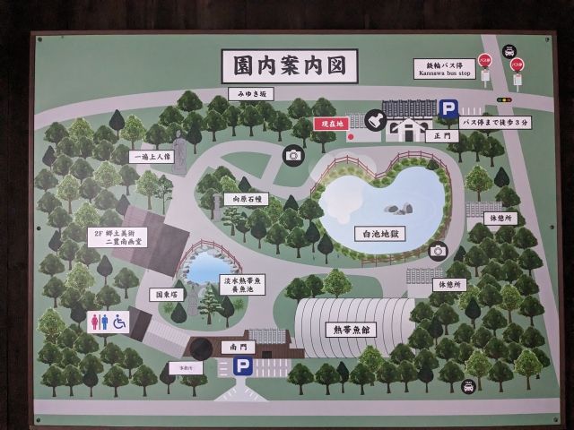 庭園や石塔などの見どころがまるでお寺みたいな、落ち着いた雰囲気の地獄。園内にはミニ水族館が設置されており、南米の大型淡水魚など個性的なサカナが多数飼育されています。