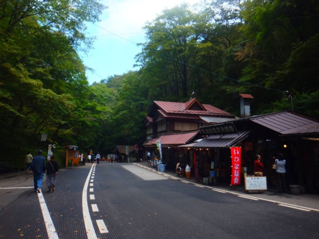 駐車場付近には出店やお土産物屋さんも並んでおり、観光地のにぎわいを見せる。いわな炭火焼きやきのこ汁など、山らしいメニューのお店が並んでいます。