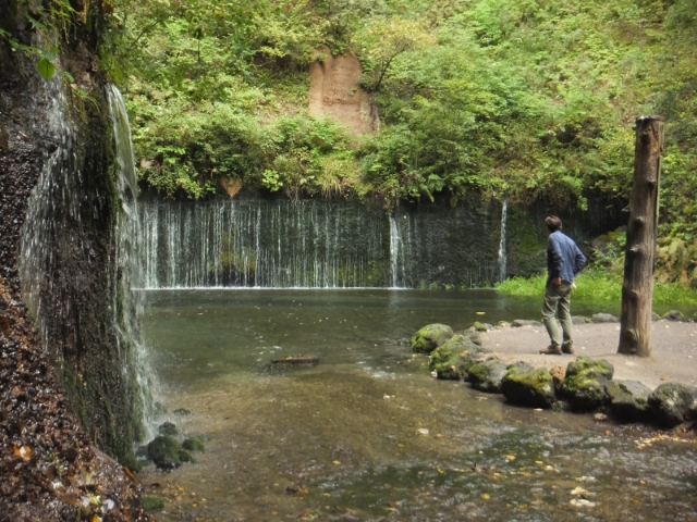 この白糸の滝、上流に川はありません。浅間山の伏流水が地中を流れ、この白糸の滝にて地上に流れ出しているのです。このように地下水を源流とする滝のことを「潜流瀑(せんりゅうばく)」と呼びます。このような滝は、雨が降った後も水が濁りづらいという特徴があります。