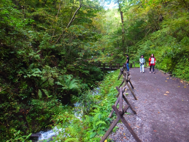 駐車場から滝までは、沢沿いの道を進みます。未舗装ですが、道幅もありそんなに歩きにくくはありません。さすがメジャースポット、きちんと手入れされています。