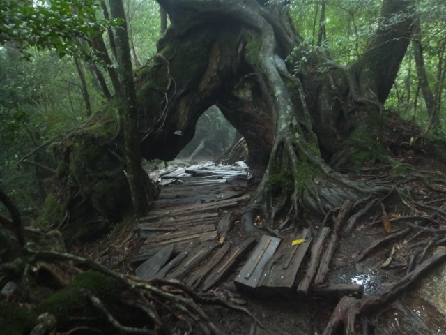 登山道に覆い塞がるのはくぐり杉!杉の股の間をくぐって進みます。倒木の上に育ったヤクスギで、その倒木が朽ちてしまったためこのようなカタチになっているそうです。