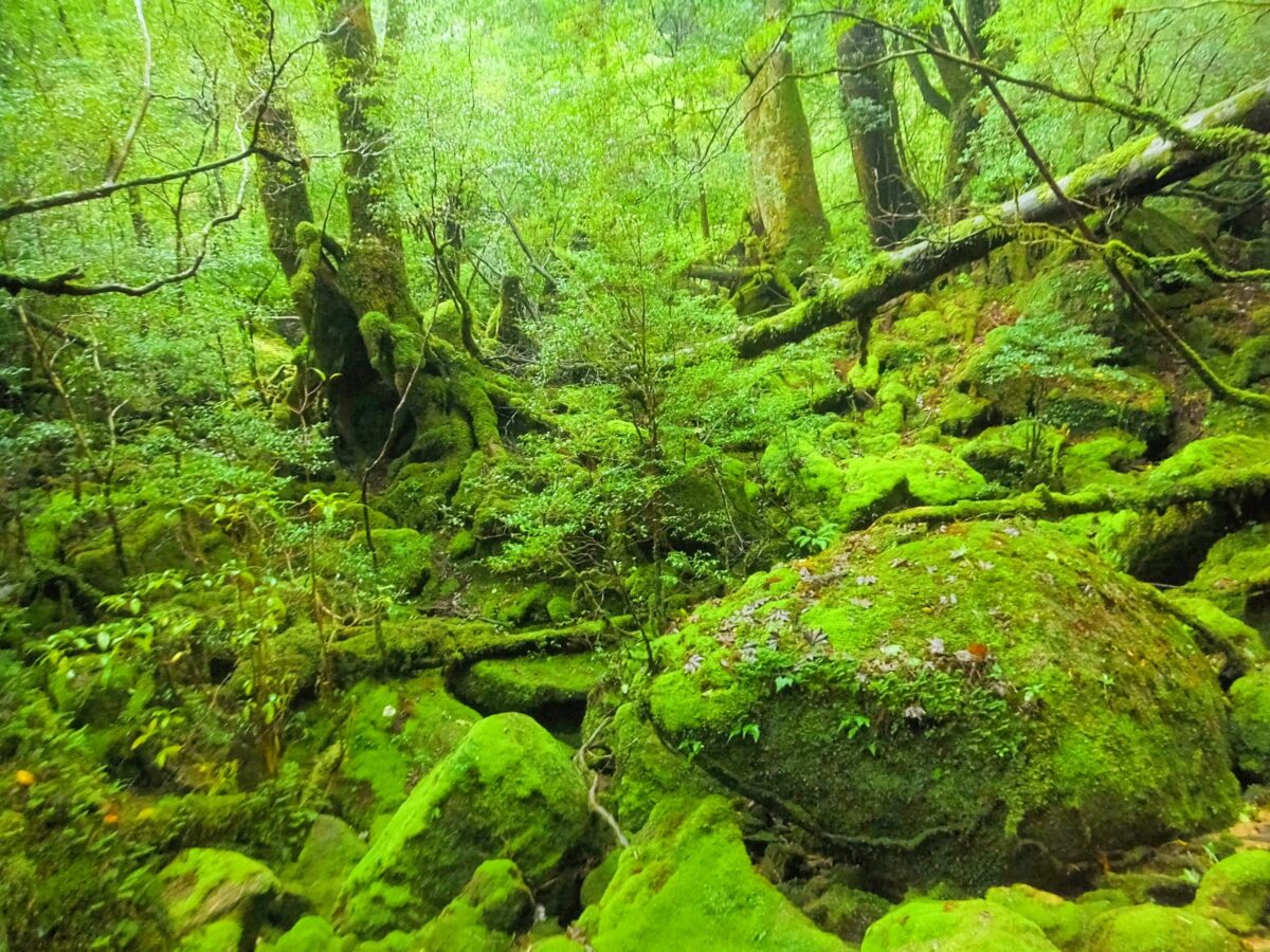 登山開始から70分、苔むす森に到着!名前の通り、一面にモスグリーンの光景が広がる、なんとも神秘的な光景。岩も倒木も全てが苔むしており、まるで絵画のような世界が広がります。